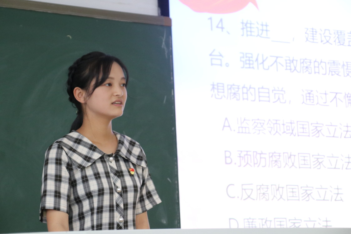 随后,相继开展了爱国知识抢答竞赛、以“新中国成立七十周年”为主题的拉歌比赛,活动现场气氛十分高涨。随后,余晓秋上台发言,她说,新时代新青年就要有一股新鲜气,每一次党日活动创新的背后都是每一个组织者,参与者的认真、努力。“我从你们的身上看到新时代的朝气,正如习近平总书记所说,‘青年是标志时代的最灵敏的晴雨表,时代的责任赋予青年,时代的光荣属于青年’,我从你们身上看到了希望。”