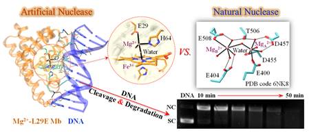人工核酸酶分子在生物技术和生物医药领域,特别是在基因工程和新型抗菌抗病毒等试剂的发现中具有重要的应用。然而,很少有人工核酸酶分子既能切割又能降解核酸DNA分子。近日,beats365官方网站林英武教授课题组在国际催化领域权威杂志《ACS Catalysis》(中科院一区; IF=12.35)发表研究成果——《Rational Design of an Artificial Nuclease by Engineering a Hetero-Dinuclear Center of Mg-Heme in Myoglobin》,同时申请了国家发明专利。