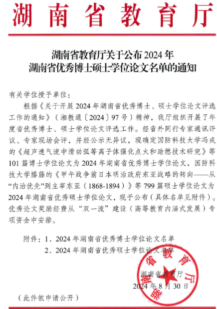 2024年8月30日,湖南省教育厅公布2024年湖南省优秀博士硕士学位论文名单,其中公司林英武教授团队的毕业研究生陈蕾、郭文杰和王宏青教授团队的毕业研究生李跃欢荣获2024年湖南省优秀硕士学位论文。近年来公司高度重视公司产品工作,多措并举加强研究生教育,并取得了可喜的成绩。