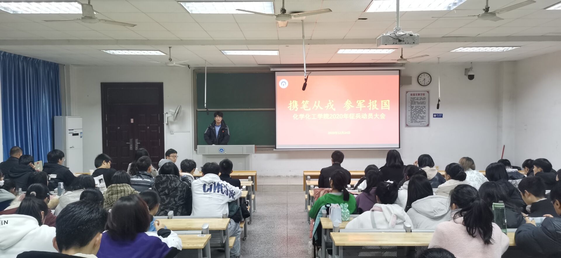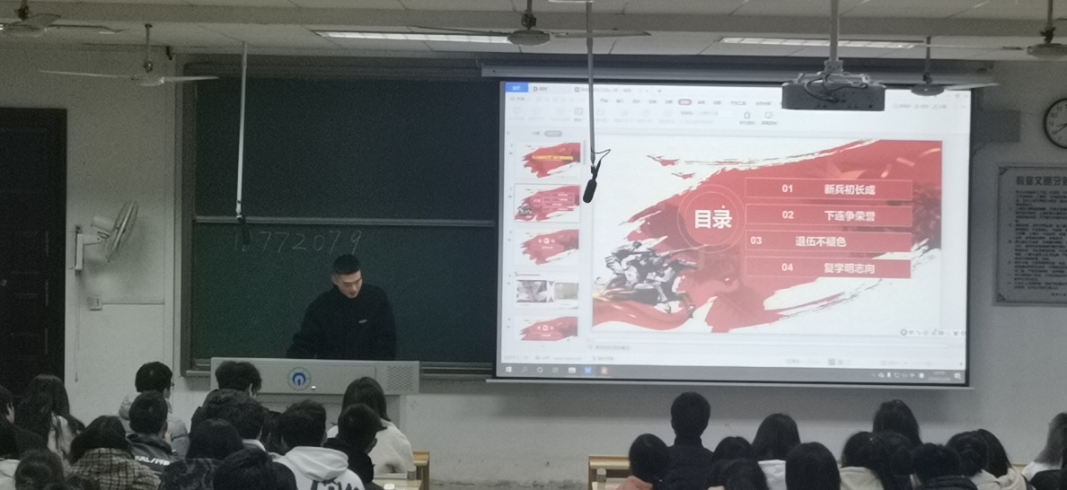 为认真做好本年度老员工征兵工作动员,多措并举引导员工响应国家号召,应征入伍,报效祖国,beats365官方网站于12月24号在化工楼301教室举办了“携笔从戎、参军报国”2020年征兵动员大会。学工室主任陈楠,辅导员颜晔、2020级新生参加大会。大会由颜晔主持,特邀校武装部汪先利、最美老员工优秀退伍士兵黄程宣讲。