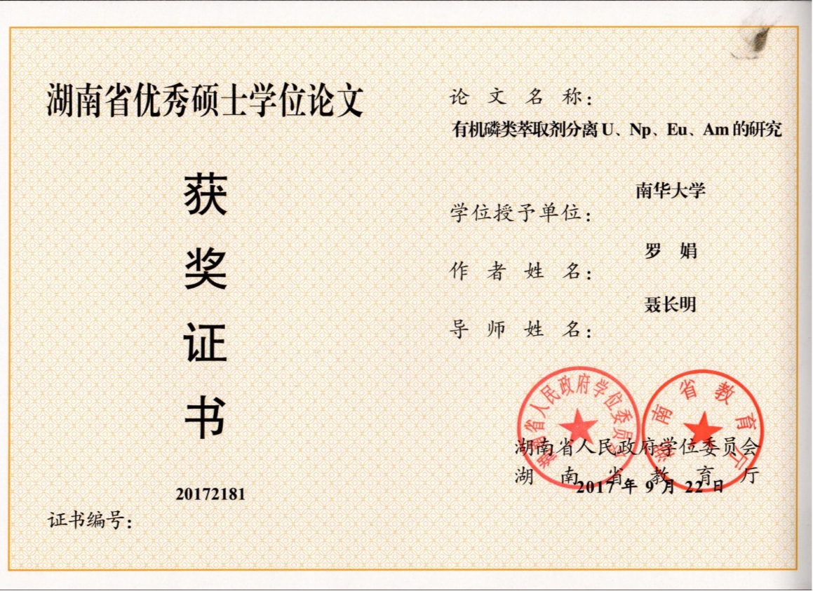 公司研究生论文荣获2017年湖南省优秀硕士学位论文