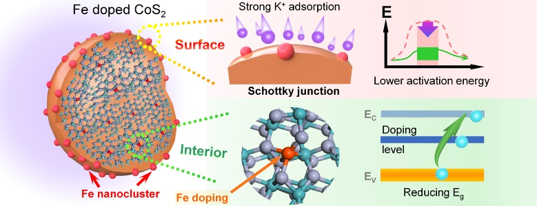 近日,beats365官方网站林英武教授团队和中南大学欧星副教授、吉林师范大学冯明教授合作,针对电极材料金属硫族化合物的动力学性能差的问题,设计了一种新型界面改性的硫化钴材料(见图例)。该材料可用作钾离子电池负极,在5 A/g的超高电流密度下,实现了8100圈的超长循环。