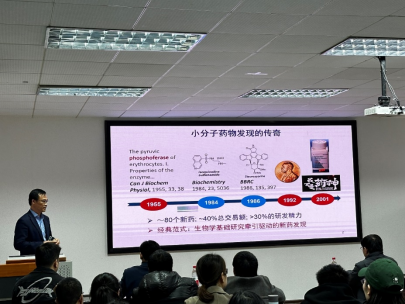 在报告中,杨财广研究员带来了题为“药物发现化员工物学”的学术报告。杨老师以“小分子药物发现”为切入点,向同学们传达了他的科研思路。他以自己做的两个课题:选择性FTO抑制剂和选择性CIpP抑制剂为例,讲述了自己的科研之路,贯穿了他对新药研发独特的思考和化员工物学工具的合理应用。