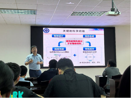 在报告中,黄辉教授介绍了一种具有高性能的非共价的“构象锁”概念,并基于碳-硫活化的聚合方法合成了一种高效、绿色的高性能有机高分子半导体材料。黄辉教授的报告会引起了在座教师与员工们的浓厚兴趣,并对在场师生所提问题进行耐心解答。