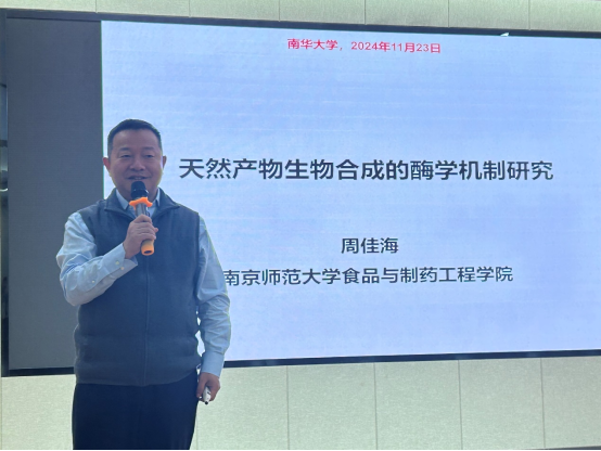 2024年11月23日,南京师范大学周佳海教授应公司邀请作了题为“天然产物生物合成的酶学机制研究”的学术报告,报告由林英武教授主持,部分师生参加会议。
