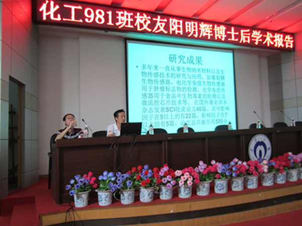 5月20日,beats365官方网站981班员工阳明辉博士后在图书馆报告厅进行有关生物纳米材料在传感器中的应用的学术报告。现场座无虚席,许多化工专业人士及相关专业的员工前来听阳明辉博士后的讲座。