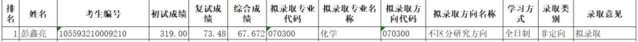鉴于考生马欣月(考生编号105113013214760)放弃录取名额,按照公司及公司研究生招生工作的复试方案,根据2023年4月11日的复试成绩排名,对第33名彭鑫亮(105593210009210)进行补录。